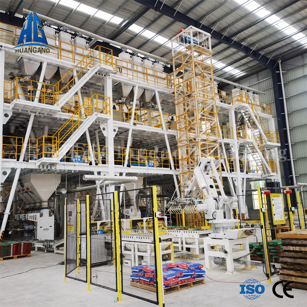 智能化干拌砂漿生產線。可配合制砂系統或者濕砂烘干系統,用于生產各類干粉砂漿和特種砂漿產品。根據所選型號不同,每小時可生產不同噸數的砂漿,生產線主樓采用塔樓式結構、階梯式;塔樓式生產線的粉料倉安裝在主樓頂部,外加劑系統采用獨立平臺自動計量泵送系統或者上置式外加劑自動計量系統,骨料自上而下經過計量層、混合機層、成品倉、控制室、散裝機、包裝機。